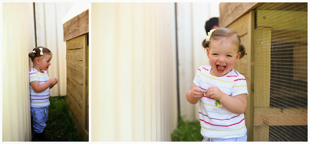 "Hide, hide, hide" you whisper and grab my hand. We run to the furthest corner of the yard and sneak behind one of the chicken coops. You yell "Dadda! Dadda!" and giggle with delight. I watch your face as he nears the coop, excitement filling your eyes... BOO! He finds us and you run to my side as the game starts all over again.